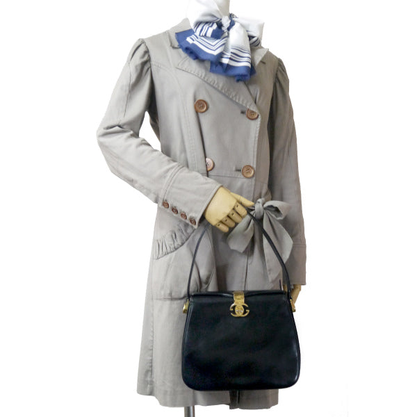 オールドグッチ ロゴ金具ターンロックレザーハンドバッグ(黒)