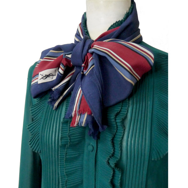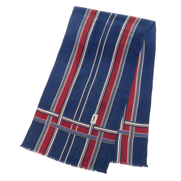 YVES SAINT LAURENT チェック柄フリンジシルクロングスカーフ(ネイビー系)