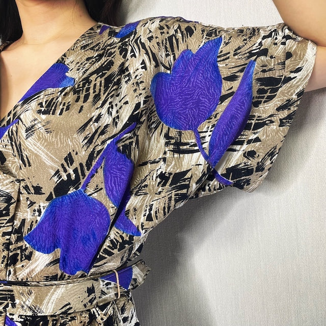 ブラック×ゴールドの総柄に、パープルのチューリップ柄がアクセントになっており、シルエットがとても綺麗!