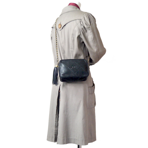 ヴィンテージシャネル ダイヤココマークステッチ チェーンフリンジバッグ(黒)
