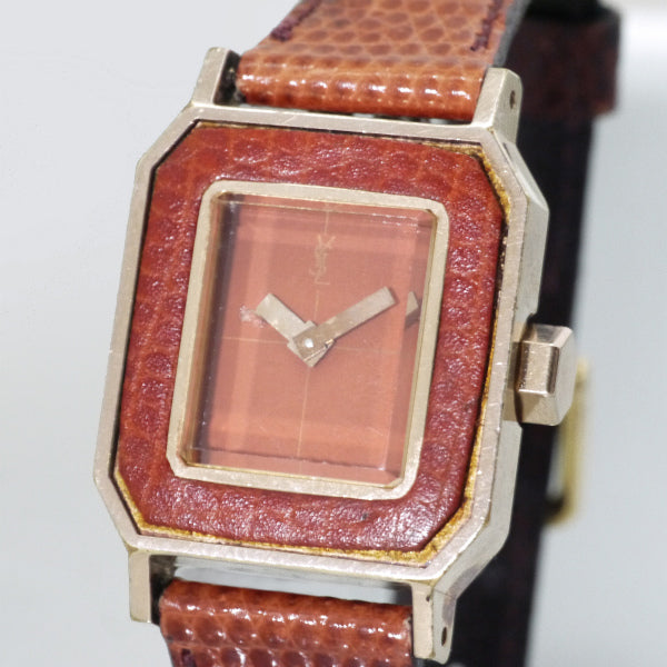 YVES SAINT LAURENT レザーロゴスクエアフェイスウォッチ(赤茶)
