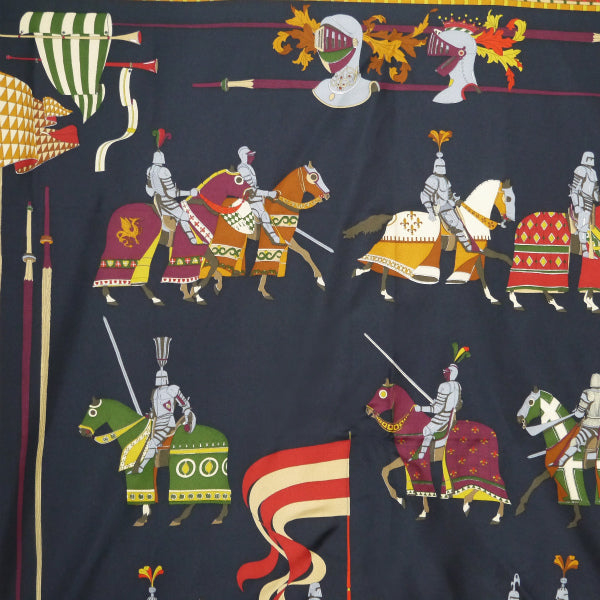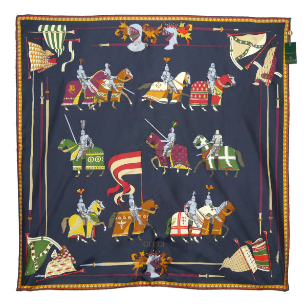 ネイビーに赤とアンティークゴールドで描かれた、騎士やフラッグが素敵なスカーフです