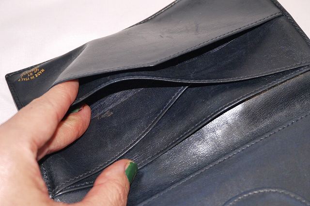 オールドグッチ レア!丸フォルム皮財布(黒) 70s RiRiファスナー 柔らかいカウ 2つ折れ財布 ダークネイビー、ホースビット金具が付いたオシャレな逸品 男女兼用ユニセックス #一見、ダークネイビーに見えますが黒に、紺と赤のシェリーライン Made in Italy サイズ(約 cm)横17.5 縦12 奥0.5 小銭入れ(内装ファスナー式) マルチポケット大6 外装・内装ともに美品 GH-015B-3 GH-015B