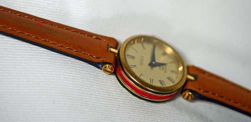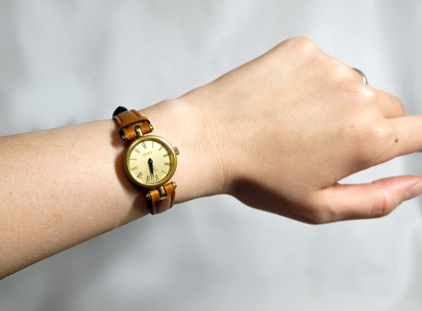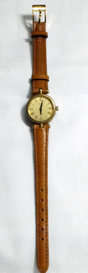 オールドグッチ シェリーフレーム腕時計 フレーム部分のさり気ないシェリーラインが素敵! キャメルの華奢なベルトが女性らしい腕時計です レディース クオーツ(電池式) 牛革バンド バンドはグッチオリジナル Made in Swiss サイズ(約 cm)幅2.5 丸型 付けた時のサイズ13.5〜17 美品 GW-002C GW-002C-20 GW-002C-8