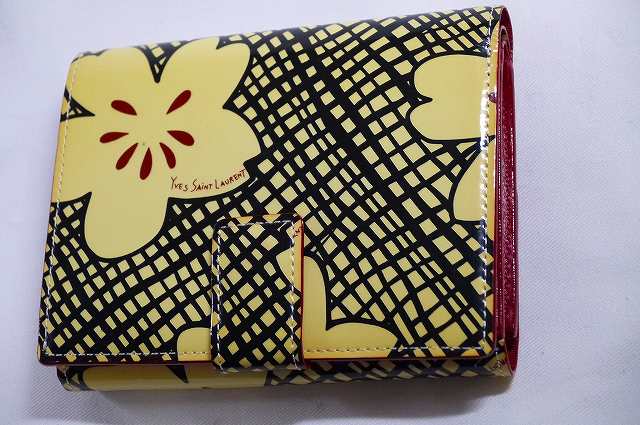 イヴサンローラン YVESSANTLAURENT 桜 財布 春の桜柄! 黄色×黒 エナメル Made in Italy サイズ(約 cm)横12 縦10 奥2 札入れ2 大型小銭入れ1(3層式に分かれています)カード入れ8 マルチポケット3 新品!美品! プレゼントにも最適! (ラッピング無料! 備考欄にご記入ください) YS-020