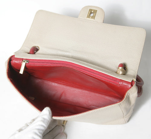オールドシャネルパイピングキルトショルダー(赤/ベージュコンビ) ヴィンテージ ラムスキン 軽くて丈夫!使いやすいベージュカラーに赤のパイピングがお洒落☆ シリアルシール有(7桁 20年程前) Made in France サイズ(約 cm)横25 縦16 奥6 ショルダー51〜86cm ハンドとショルダーで2wayでお使いいただけます 内装 ファスナーポケット1 外ポケット小1