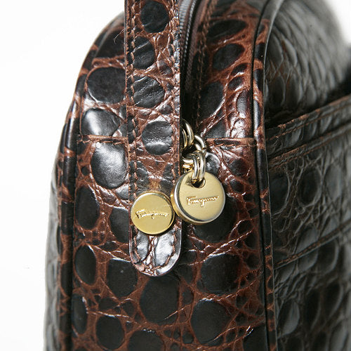 フェラガモ 型押しショルダー(茶) エレガントなフェラガモの定番のリボンのデザイン 艶のある型押しレザーにゴールドの金具がクラス感バツグン! Made in Italy サイズ(約 cm)横24 縦18 奥8 ショルダー長 121〜129 3穴 斜めがけ可 内装、外装 牛革 外ポケット1 内装ファスナーポケット1 長財布は横に入ります 外装・内装ともに美品 保存袋付き