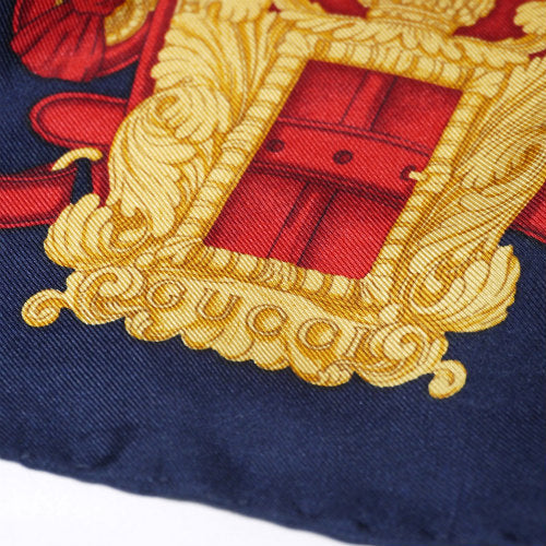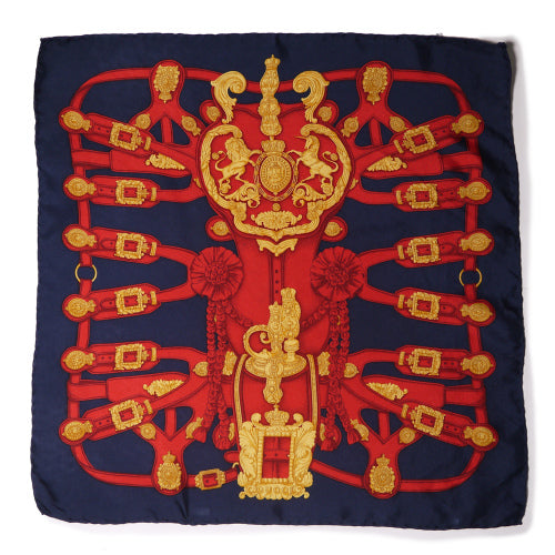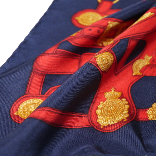 ネイビーに赤とアンティークゴールドで描かれた、ライオンやペガサス、ベルトがゴージャスなミニスカーフ