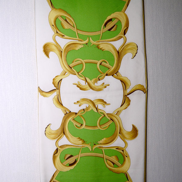 白地にゴージャスなゴールドの模様、鮮やかなグリーンがポイントになったデザイン