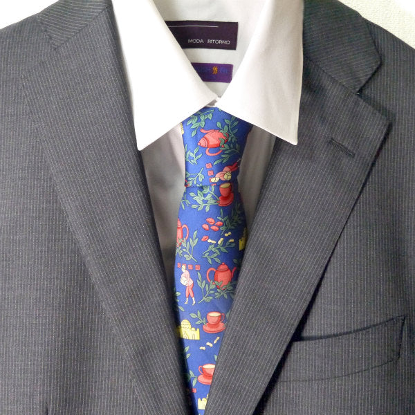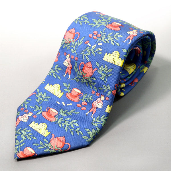 宮殿の庭での1シーンを切り取ったような、ハーブ草・ティーポットやカップがデザインされた遊び心あふれるネクタイです