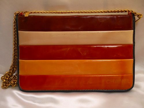 シャネル マルチカラーバッグ(黄系) <グッチの高級チェーンがオマケで付いています> 元々、クラッチバッグですが、全く違和感のないチェーンを付けてワンショルダーとしても。 10年位前のモデルで現在は販売されていません。 ベージュ×イエロー×ブラウン Maid in Italy エナメル×皮(内装は布で美品) 本体シリアルシール有り(7桁 67番台)・ サイズ(約 cm)横23.5 縦16 奥2 ショルダー長83(肩掛けタイプ) 内装 2分割 ファスナーポケット2 全体的に特有のべたつき、少々の汚れあり。格安で!