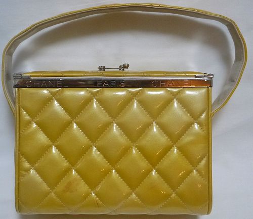 シャネル エナメルバニティバッグ(黄色) エナメル皮 マトラッセ シール有り(7桁)10年位前のお品です Made in France サイズ(約 cm)横19 縦14 奥10 内装ポケット1個 内装本革 外装は、少しのベタ付きと、汚れがあります(画像) 格安で! 内装は美品