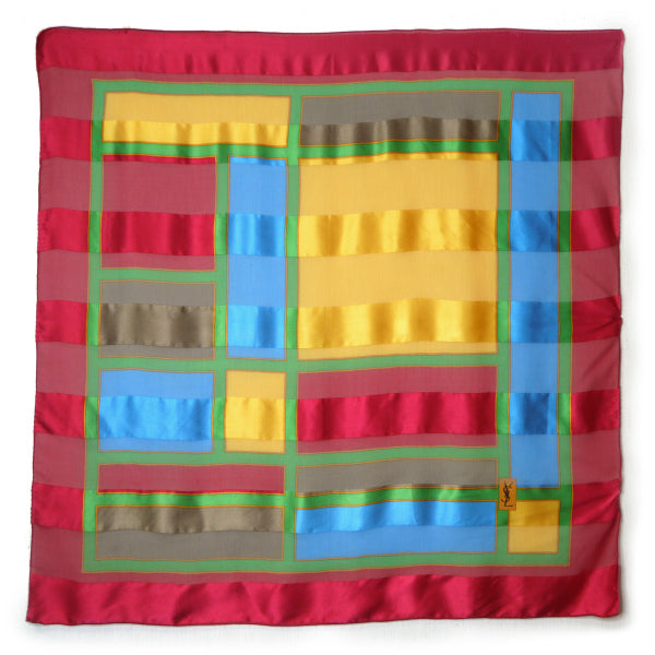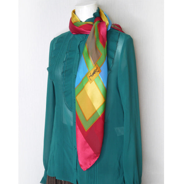 YVES SAINT LAURENT シルク大判スカーフ マルチブロックカラー(赤系)