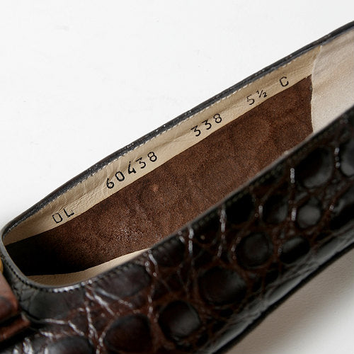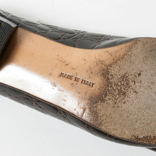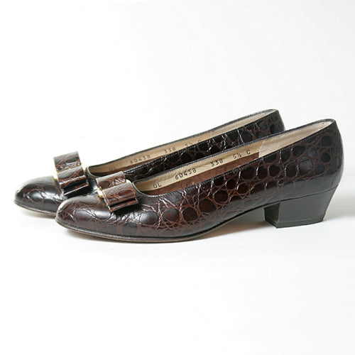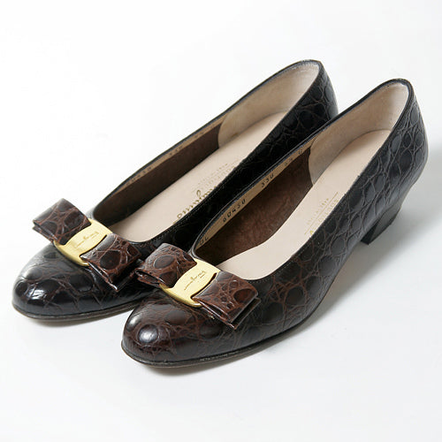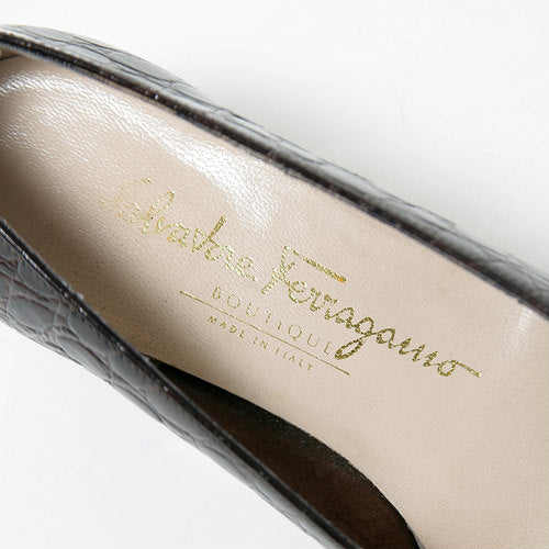 フェラガモ リボンパンプス 濃茶色 クロコダイル型押し 本革 5 1/2サイズ 22.5〜23cm位 Made in Italy 箱付き ヒール部分新品に交換済み 外装・内装ともに美品