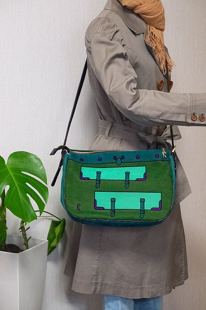 RB-017G RB-017G-11 RB-017G-6 ロベルタ 騙し絵 モケット生地 トートバッグ グリーン/ブルー 素敵なだまし絵 表と裏側が同じデザインです。 軽いコットン素材の高級感あるモケット素材なので斜めがけが楽! Made in Italy サイズ(約 cm)横36 縦28 奥 最大10 斜めがけ用 サイドそれぞれ3段階調整 最大109〜123 入り口ファスナー