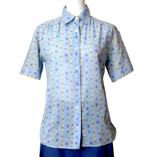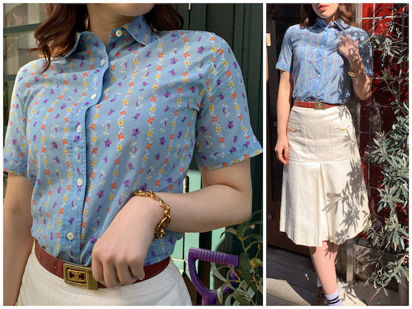 オールドセリーヌ レア!!フラワー柄レトロ半袖ブラウス(水色)