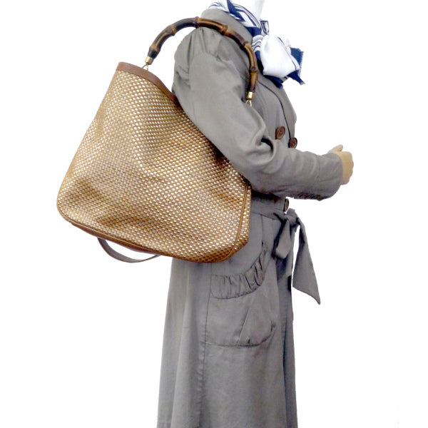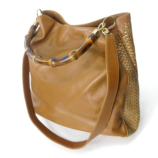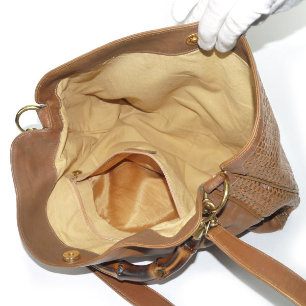 オールドグッチ リバーシブル!!編み込みレザーバンブーバッグ(茶・大)