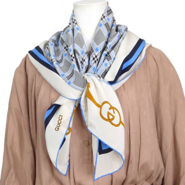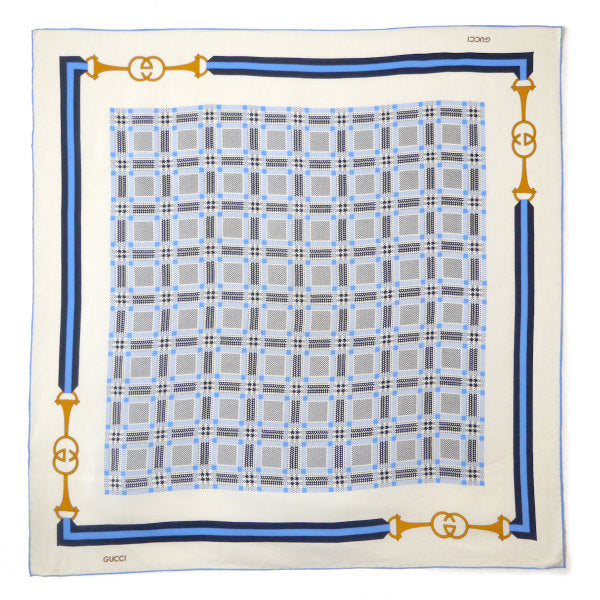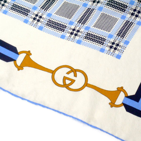 OLD Gucci グレンチェック×GGベルト柄シルクスカーフ(青系)